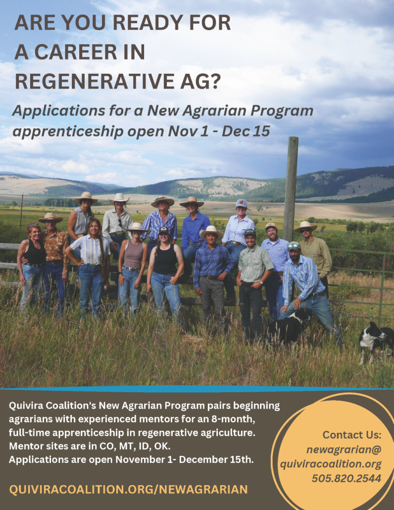 Quivira Coalition’s New Agrarian Program is recruiting apprentices for the 2026 season through December 15, 2025, or until all positions are filled. New Agrarian Program apprenticeships take place on working regenerative ranches and farms across the Intermountain West. These eight-month, full-time, paid apprenticeships include housing and immerse the apprentice in the daily work of an operation. The New Agrarian Program offers support, including travel reimbursements for two regional in-person gatherings, an education stipend, monthly supplemental education webinars, one-on-one check-ins with a coordinator, networking opportunities to kick-start a career in regenerative agriculture, and complimentary attendance at the annual REGENERATE conference. Apprenticeships begin in March/April 2026 and run through October 2026.