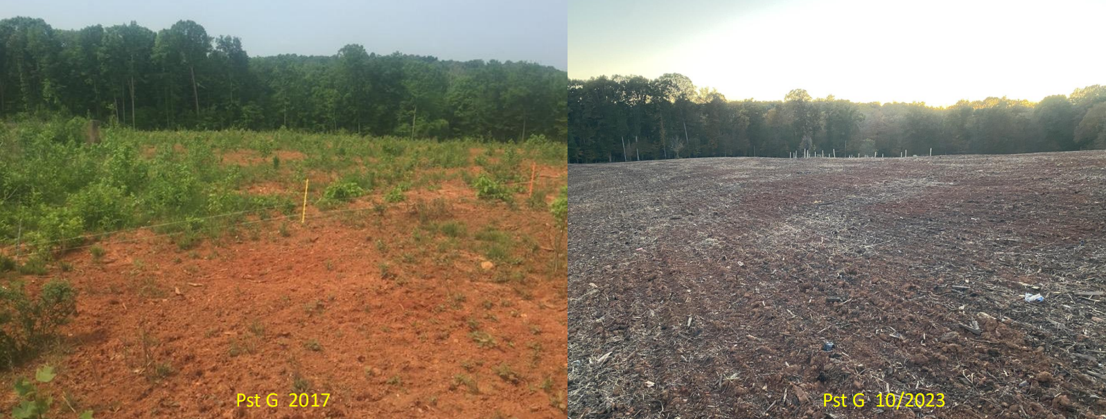 Suzanne developed the system so that when the feed was gone, it was time to move the animals. The formula she uses holds no matter how many animals are being fed, how big they are, or how long they stay on the pasture. Suzanne was after the impact the animals would have on the soil–rooting, disturbing, and incorporating manure, urine, and spent feed. Anyone who has seen the aftereffects of well-managed pig grazing will know this tactic can yield incredible results, as indicated by the accompanying before and after photos of Suzanne’s pastures.