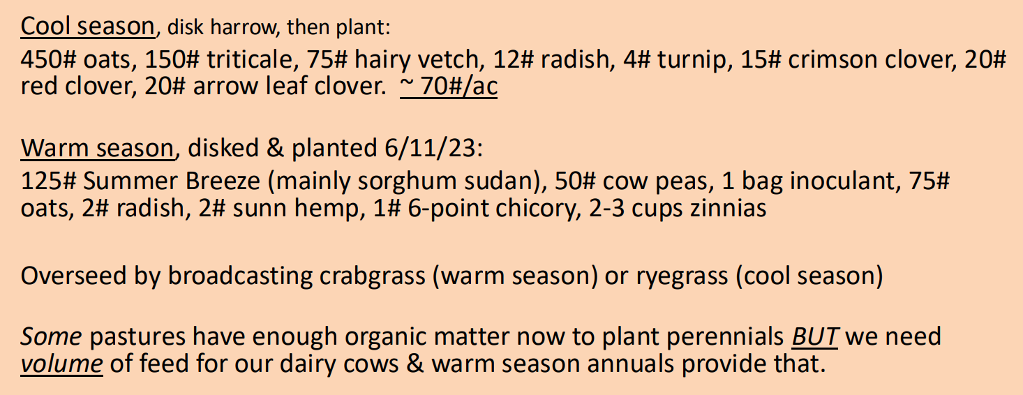 Speaking of annuals, other producers have asked Suzanne why she doesn’t plant perennial pastures. After all, annual crops require tillage and energy while perennials, especially cool season perennials, can supply high quality dairy feed while building soil resilience. Her soils could not support perennial production, and there was an immediate need for high quality forages. The annual crops she uses, such as clovers, ryegrass, and brassicas, are rocket fuel for growing and lactating animals.