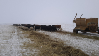 Sheep and cattle overwinter together, sharing a single set of shelters, which allows for one set of chores and feeding. The Ollilas use a carefully layered feed ration to reduce waste, with a mix of grain hays, alfalfa, grass hay, millet, and sorghum sudangrass. The bales are fed in a sequenced fashion, first unrolling the sorghum, then grain hay, then alfalfa hay. The bale processor is set to a short cut to allow the calves and sheep access to the feed. Cofeeding reduces waste as the cows eat the larger feedstuffs and the sheep clean up the finer material such as the alfalfa leaves, resulting in higher overall utilization and nutritional benefit across the flerd.